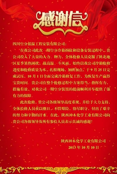 此次搶修,貴公司各級領(lǐng)導(dǎo)高度重視,并給予大力支持,全體檢修人員夜以繼日,不畏艱險,恪盡職守,付出了艱辛的努力和辛勤的汗水。在此,陜西神木化學(xué)工業(yè)有限公司向貴公司各級領(lǐng)導(dǎo)及所有參檢人員表示真誠的感謝!
