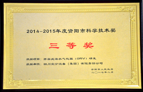 由我公司研發(fā)的開架式海水氣化器(ORV),被資陽市人民政府評為2014—2015年度資陽市科學技術獎三等獎。