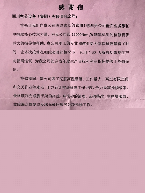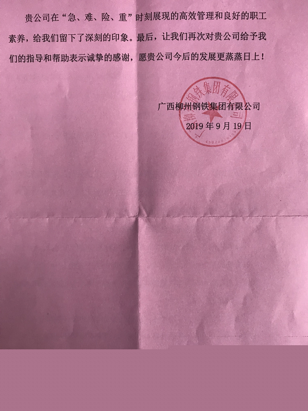2019年9月19日,廣西柳州鋼鐵集團有限公司向我公司發(fā)來感謝信,對我公司在廣西柳鋼設(shè)備維修工作中給予的指導(dǎo)和幫助表示真誠感謝。