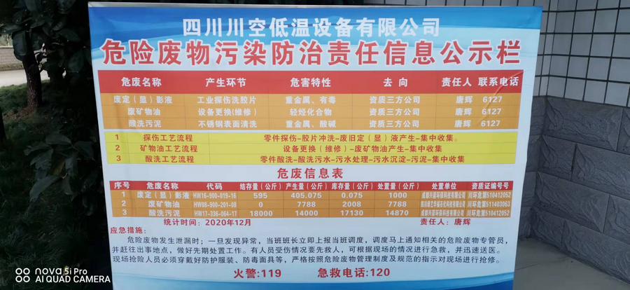 四川川空低溫設(shè)備有限公司——危險(xiǎn)廢物污染防治責(zé)任信息公示欄