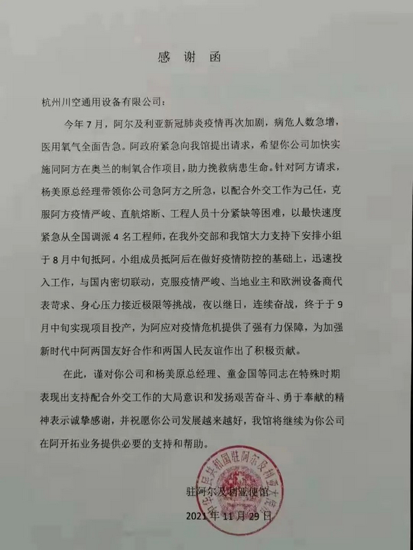 2021年11月29日,中國(guó)駐阿爾及利亞大使館給我公司杭州川空發(fā)來(lái)感謝信,對(duì)杭州川空在新冠疫情十分嚴(yán)峻的情況下,克服困難支持阿方推動(dòng)液體空分的投產(chǎn),助力挽救病患生命所作出的努力表示感謝,對(duì)杭州川空楊美原總經(jīng)理以及童金國(guó)等同志在特殊時(shí)期支持和配合外交工作的大局意識(shí)和發(fā)揚(yáng)艱苦奮斗、勇于奉獻(xiàn)的精神表示感謝。