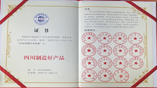 我公司生產(chǎn)的“LNG冷能空分設(shè)備”——被評(píng)為“四川制造好產(chǎn)品”