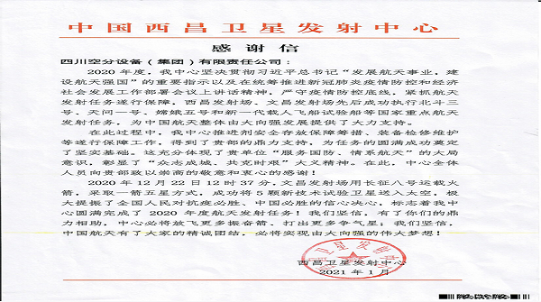西昌衛(wèi)星發(fā)射中心給我公司發(fā)來(lái)感謝信——對(duì)我公司在中國(guó)航天事業(yè)發(fā)展中的貢獻(xiàn)表示感謝
