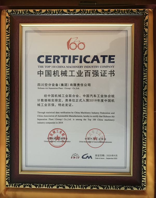 近日,我公司被評(píng)為2019年中國(guó)機(jī)械工業(yè)百?gòu)?qiáng)企業(yè),位列第70名。這項(xiàng)榮譽(yù)代表著客戶、行業(yè)和社會(huì)對(duì)四川空分集團(tuán)的肯定和認(rèn)可。