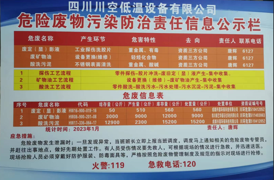 四川川空低溫設(shè)備有限公司——危險(xiǎn)廢物污染防治責(zé)任信息公示欄